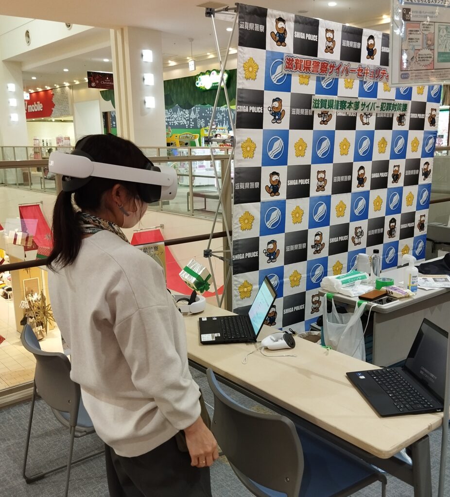 2025年 11月29日(土) 13時〜15時 フォレオ大津一里山にて「滋賀県警主催 サイバーセキュリティイベント」にて、VR体験ブースを担当しました。参加してくださった方は30名以上いらっしゃいました。大人も子どもも、オンラインゲームに関係する犯罪に巻き込まれないように、インターネットから身を守る必要があることを体験していただきました。体験してくださった皆様ありがとうございました!「こわい…」と泣いてしまう子、VRゴーグルを途中で外してしまう子、怖さのあまり身動きを取らず前だけをじっと見ている子、リアクションは様々でしたが、仮想空間の中での体験は逃げ場のない怖さがあるようです。もちろん平気に楽しんでくれた子もたくさんいました。みなさんインターネットには気をつけましょう!